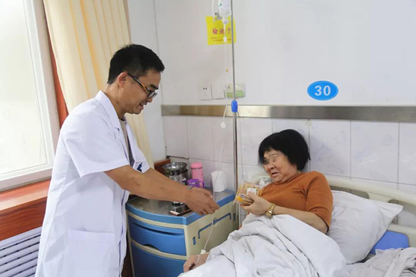 每到一间病房,李志强院长都会为患者及家属送上节日的问候和祝福,并详细询问患者情况,嘱咐他们安心养病。
